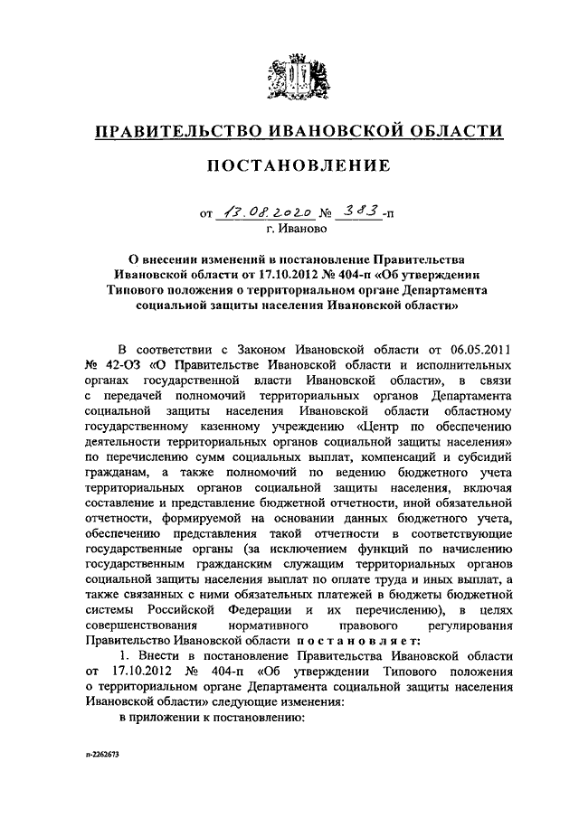 Постановление Правительства Ивановской области от 13.08.2020 N 383-п "О внесении изменений в постановление Правительства Ивановской области от 17.10.2012 N 404-п "Об утверждении Типового положения о территориальном органе Департамента социальной защиты населения Ивановской области"