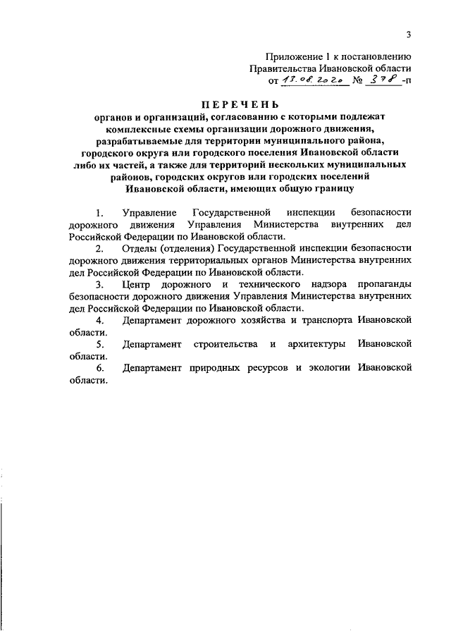 Постановление Правительства Ивановской области от 13.08.2020 N 378-п "Об утверждении перечня органов и организаций, согласованию с которыми подлежат комплексные схемы организации дорожного движения, разрабатываемые для территории муниципального района, городского округа или городского поселения Ивановской области либо их частей, а также для территорий нескольких муниципальных районов, городских округов или городских поселений Ивановской области, имеющих общую границу, и перечня органов и организаций, согласованию с которыми подлежат проекты организации дорожного движения, разрабатываемые для автомобильных дорог регионального или межмуниципального значения Ивановской области либо их участков"