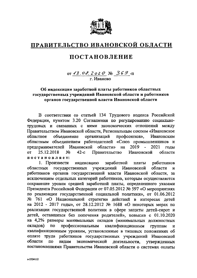 Постановление Правительства Ивановской области от 13.08.2020 N 369-п "Об индексации заработной платы работников областных государственных учреждений Ивановской области и работников органов государственной власти Ивановской области"