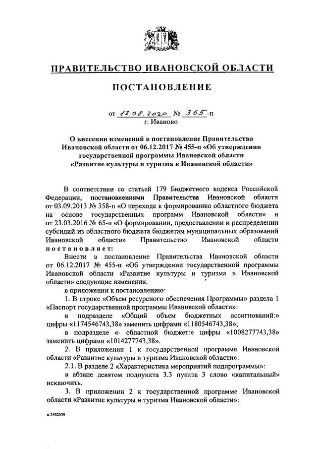 Постановление Правительства Ивановской области от 13.08.2020 N 365-п "О внесении изменений в постановление Правительства Ивановской области от 06.12.2017 N 455-п "Об утверждении государственной программы Ивановской области "Развитие культуры и туризма в Ивановской области"
