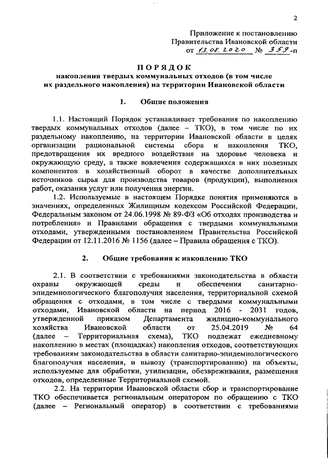 Постановление Правительства Ивановской области от 13.08.2020 N 359-п "Об утверждении Порядка накопления твердых коммунальных отходов (в том числе их раздельного накопления) на территории Ивановской области"