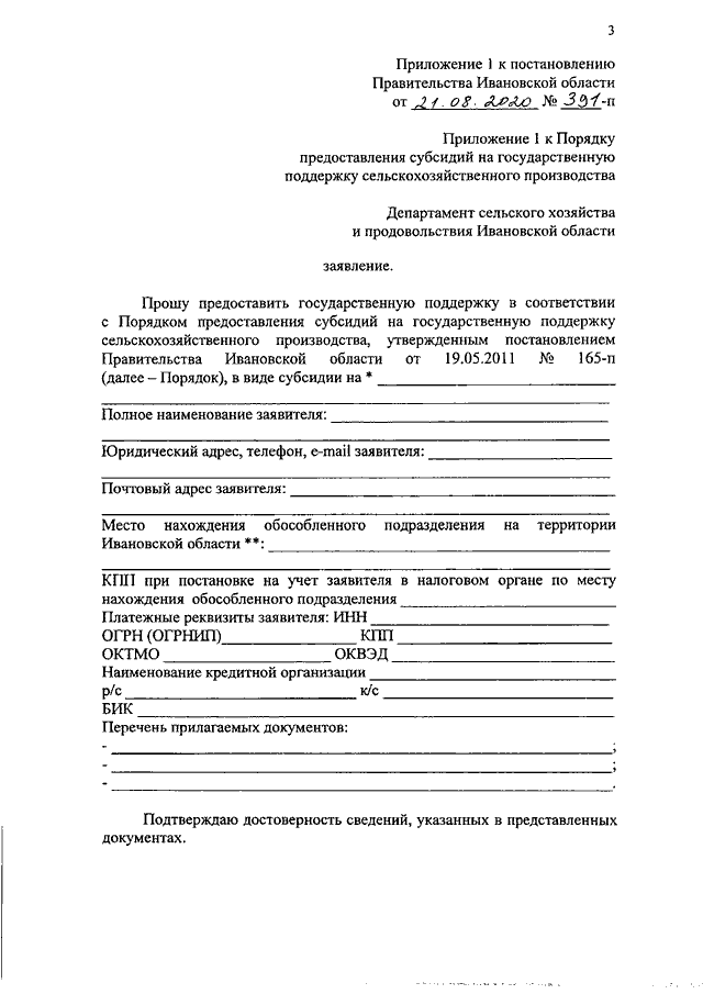 Постановление Правительства Ивановской области от 21.08.2020 N 391-п "О внесении изменений в постановление Правительства Ивановской области от 19.05.2011 N 165-п "Об утверждении Порядка предоставления субсидий на государственную поддержку сельскохозяйственного производства" (вместе с "Размером первоначального взноса и номенклатурой предметов лизинга, по которым предоставляется субсидия, в соответствии с Общероссийским классификатором продукции по видам экономической деятельности (ОКПД2) ОК 034-2014, утвержденным приказом Росстандарта от 31.01.2014 N 14-ст")