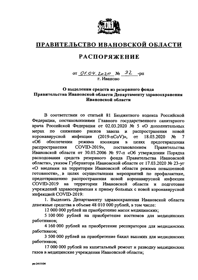 Распоряжение Правительства Ивановской области от 01.04.2020 N 32-рп "О выделении средств из резервного фонда Правительства Ивановской области Департаменту здравоохранения Ивановской области"