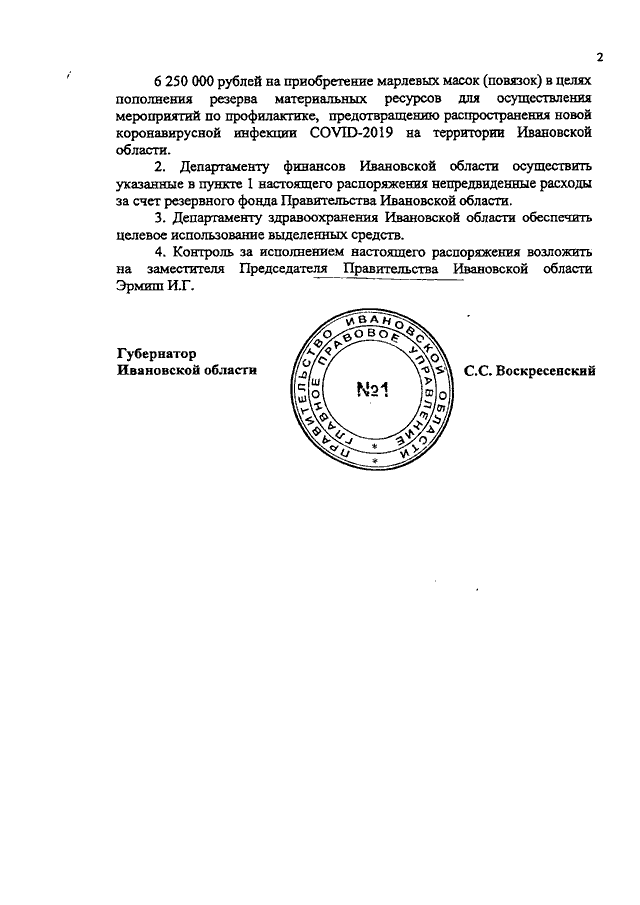 Распоряжение Правительства Ивановской области от 01.04.2020 N 32-рп "О выделении средств из резервного фонда Правительства Ивановской области Департаменту здравоохранения Ивановской области"