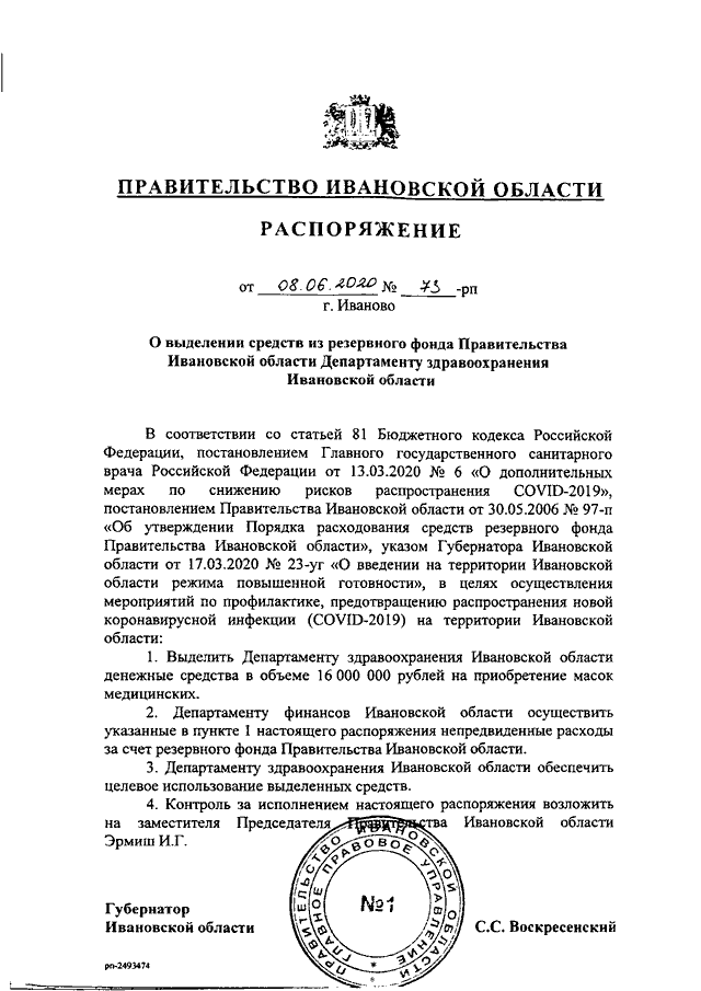 Распоряжение Правительства Ивановской области от 08.06.2020 N 73-рп "О выделении средств из резервного фонда Правительства Ивановской области Департаменту здравоохранения Ивановской области"