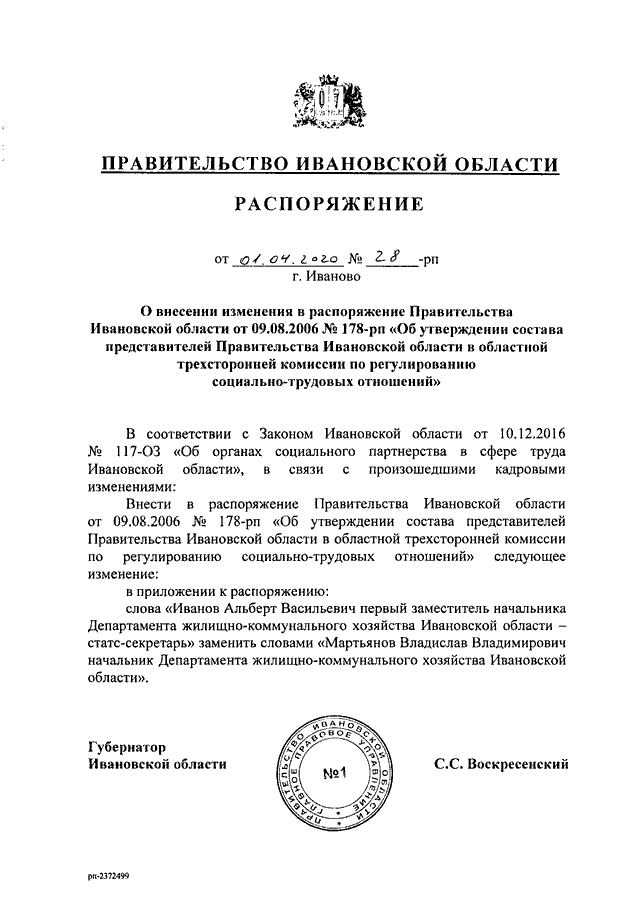 Распоряжение Правительства Ивановской области от 01.04.2020 N 28-рп "О внесении изменения в распоряжение Правительства Ивановской области от 09.08.2006 N 178-рп "Об утверждении состава представителей Правительства Ивановской области в областной трехсторонней комиссии по регулированию социально-трудовых отношений"