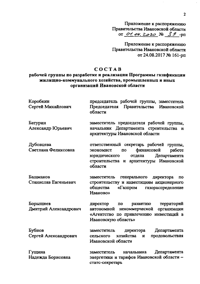 Распоряжение Правительства Ивановской области от 01.04.2020 N 39-рп "О внесении изменения в распоряжение Правительства Ивановской области от 24.08.2017 N 161-рп "О создании рабочей группы по разработке и реализации Программы газификации жилищно-коммунального хозяйства, промышленности и иных организаций Ивановской области"