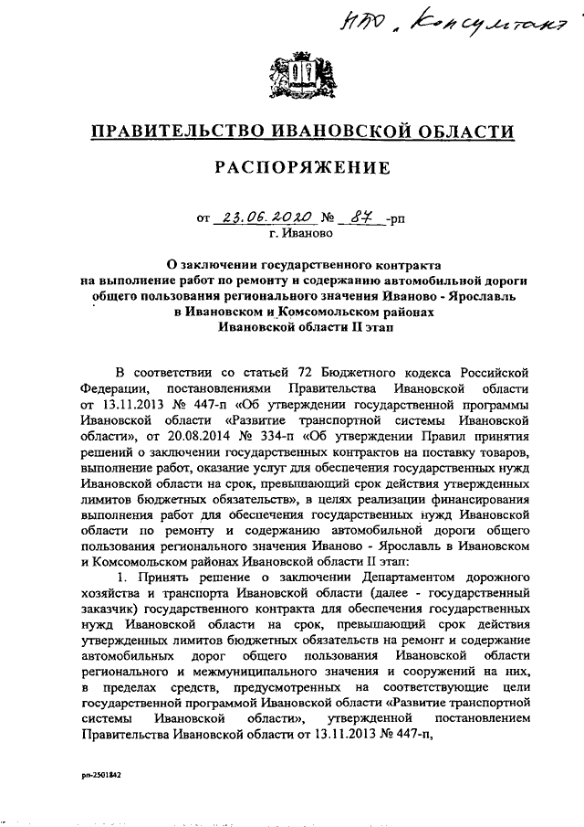 Распоряжение Правительства Ивановской области от 23.06.2020 N 87-рп "О заключении государственного контракта на выполнение работ по ремонту и содержанию автомобильной дороги общего пользования регионального значения Иваново - Ярославль в Ивановском и Комсомольском районах Ивановской области, II этап"