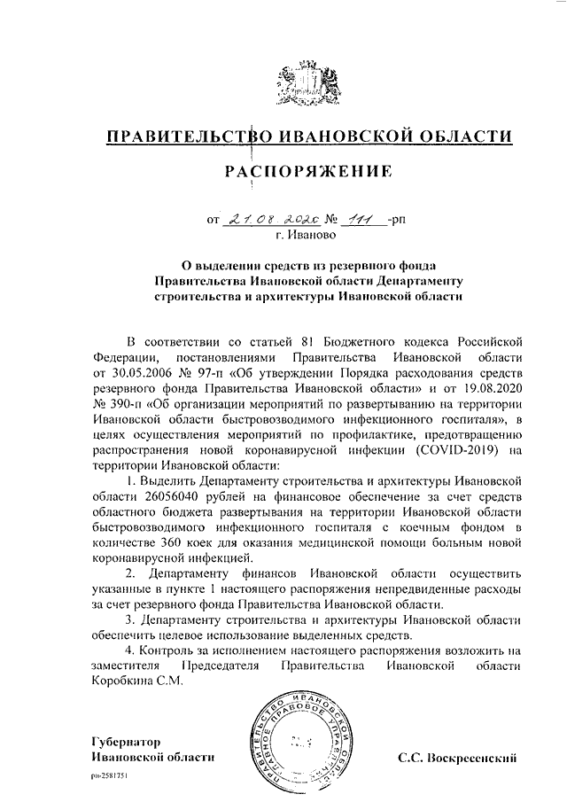 Распоряжение Правительства Ивановской области от 21.08.2020 N 111-рп "О выделении средств из резервного фонда Правительства Ивановской области Департаменту строительства и архитектуры Ивановской области"