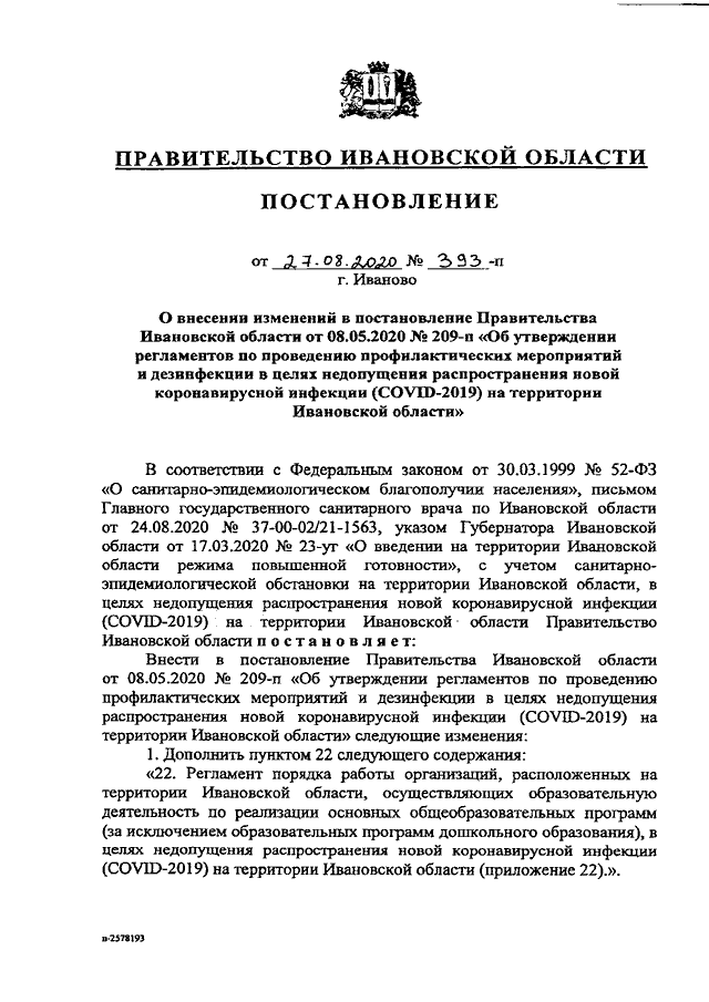 Постановление Правительства Ивановской области от 27.08.2020 N 393-п "О внесении изменений в постановление Правительства Ивановской области от 08.05.2020 N 209-п "Об утверждении регламентов по проведению профилактических мероприятий и дезинфекции в целях недопущения распространения новой коронавирусной инфекции (COVID-2019) на территории Ивановской области" (вместе с "Регламентом порядка работы организаций, расположенных на территории Ивановской области, осуществляющих образовательную деятельность по реализации основных общеобразовательных программ (за исключением образовательных программ дошкольного образования), в целях недопущения распространения новой коронавирусной инфекции (COVID-2019) на территории Ивановской области")