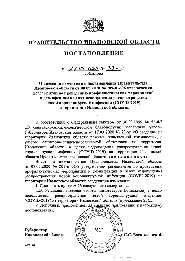 Постановление Правительства Ивановской области от 28.08.2020 N 397-п "О внесении изменений в постановление Правительства Ивановской области от 08.05.2020 N 209-п "Об утверждении регламентов по проведению профилактических мероприятий и дезинфекции в целях недопущения распространения новой коронавирусной инфекции (COVID-2019) на территории Ивановской области" (вместе с "Регламентом порядка работы кинотеатров (кинозалов) в целях недопущения распространения новой коронавирусной инфекции (COVID-2019) на территории Ивановской области")