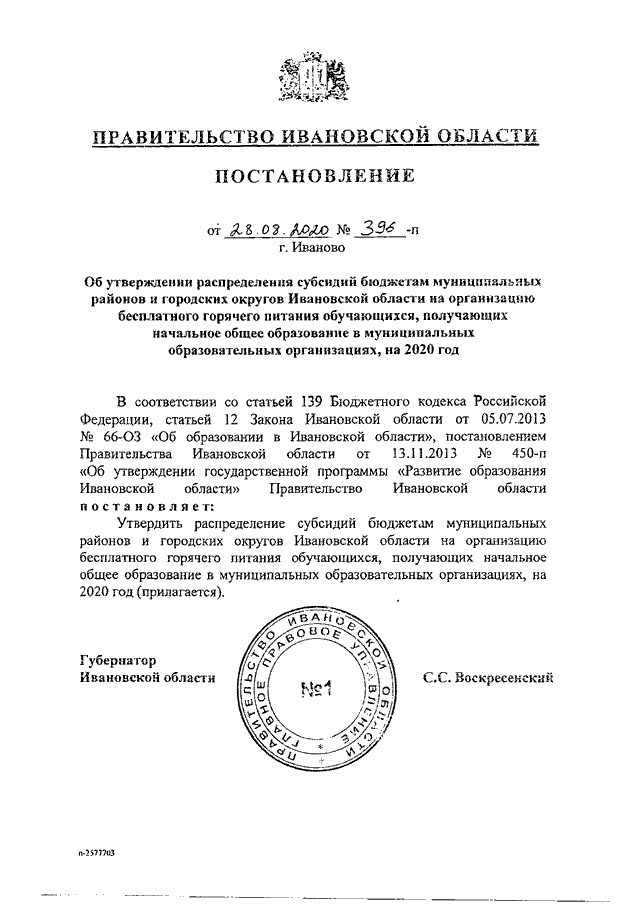 Постановление Правительства Ивановской области от 28.08.2020 N 396-п "Об утверждении распределения субсидий бюджетам муниципальных районов и городских округов Ивановской области на организацию бесплатного горячего питания обучающихся, получающих начальное общее образование в муниципальных образовательных организациях, на 2020 год"