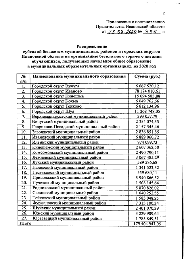 Постановление Правительства Ивановской области от 28.08.2020 N 396-п "Об утверждении распределения субсидий бюджетам муниципальных районов и городских округов Ивановской области на организацию бесплатного горячего питания обучающихся, получающих начальное общее образование в муниципальных образовательных организациях, на 2020 год"