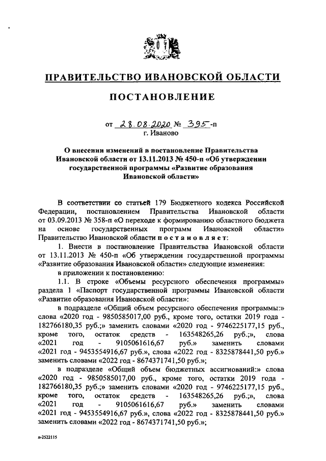 Постановление Правительства Ивановской области от 28.08.2020 N 395-п "О внесении изменений в постановление Правительства Ивановской области от 13.11.2013 N 450-п "Об утверждении государственной программы "Развитие образования Ивановской области" (вместе с "Порядком предоставления грантов в форме субсидий организациям, осуществляющим образовательную деятельность по образовательным программам среднего профессионального образования, на финансовое обеспечение обучения граждан Российской Федерации по имеющим государственную аккредитацию образовательным программам среднего профессионального образования", "Порядком предоставления и распределения субсидий бюджетам муниципальных районов и городских округов Ивановской области на организацию бесплатного горячего питания обучающихся, получающих начальное общее образование в муниципальных образовательных организациях")