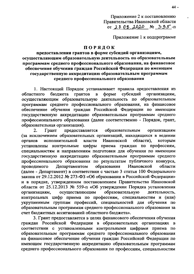 Постановление Правительства Ивановской области от 28.08.2020 N 395-п "О внесении изменений в постановление Правительства Ивановской области от 13.11.2013 N 450-п "Об утверждении государственной программы "Развитие образования Ивановской области" (вместе с "Порядком предоставления грантов в форме субсидий организациям, осуществляющим образовательную деятельность по образовательным программам среднего профессионального образования, на финансовое обеспечение обучения граждан Российской Федерации по имеющим государственную аккредитацию образовательным программам среднего профессионального образования", "Порядком предоставления и распределения субсидий бюджетам муниципальных районов и городских округов Ивановской области на организацию бесплатного горячего питания обучающихся, получающих начальное общее образование в муниципальных образовательных организациях")