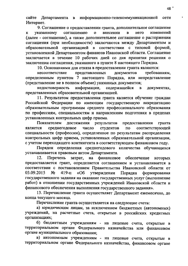 Постановление Правительства Ивановской области от 28.08.2020 N 395-п "О внесении изменений в постановление Правительства Ивановской области от 13.11.2013 N 450-п "Об утверждении государственной программы "Развитие образования Ивановской области" (вместе с "Порядком предоставления грантов в форме субсидий организациям, осуществляющим образовательную деятельность по образовательным программам среднего профессионального образования, на финансовое обеспечение обучения граждан Российской Федерации по имеющим государственную аккредитацию образовательным программам среднего профессионального образования", "Порядком предоставления и распределения субсидий бюджетам муниципальных районов и городских округов Ивановской области на организацию бесплатного горячего питания обучающихся, получающих начальное общее образование в муниципальных образовательных организациях")