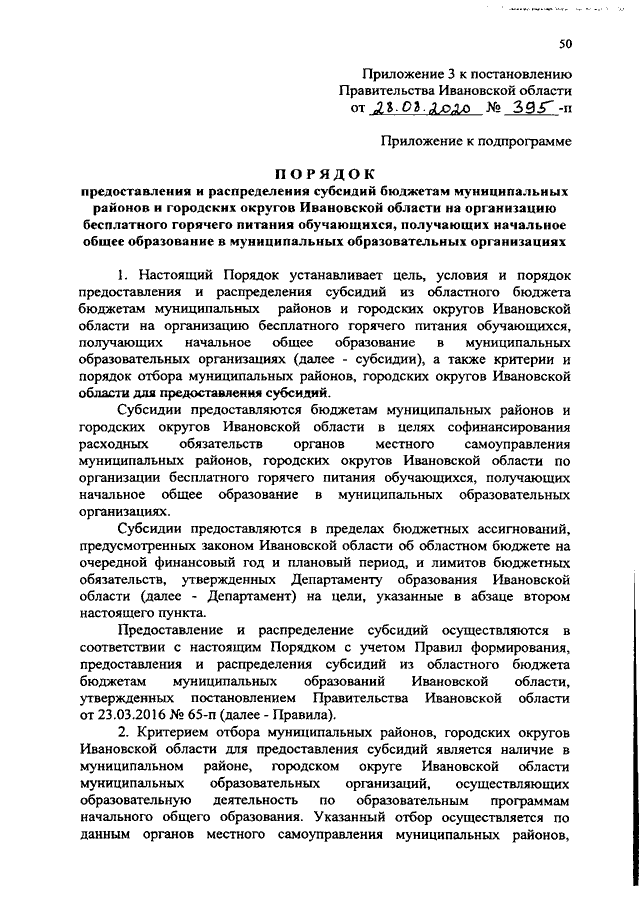 Постановление Правительства Ивановской области от 28.08.2020 N 395-п "О внесении изменений в постановление Правительства Ивановской области от 13.11.2013 N 450-п "Об утверждении государственной программы "Развитие образования Ивановской области" (вместе с "Порядком предоставления грантов в форме субсидий организациям, осуществляющим образовательную деятельность по образовательным программам среднего профессионального образования, на финансовое обеспечение обучения граждан Российской Федерации по имеющим государственную аккредитацию образовательным программам среднего профессионального образования", "Порядком предоставления и распределения субсидий бюджетам муниципальных районов и городских округов Ивановской области на организацию бесплатного горячего питания обучающихся, получающих начальное общее образование в муниципальных образовательных организациях")