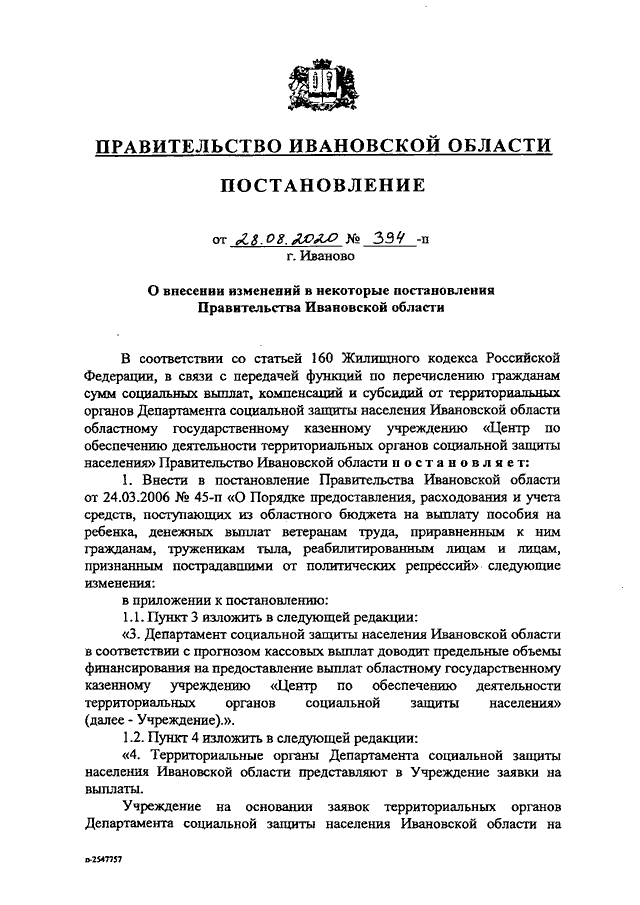 Постановление Правительства Ивановской области от 28.08.2020 N 394-п "О внесении изменений в некоторые постановления Правительства Ивановской области"