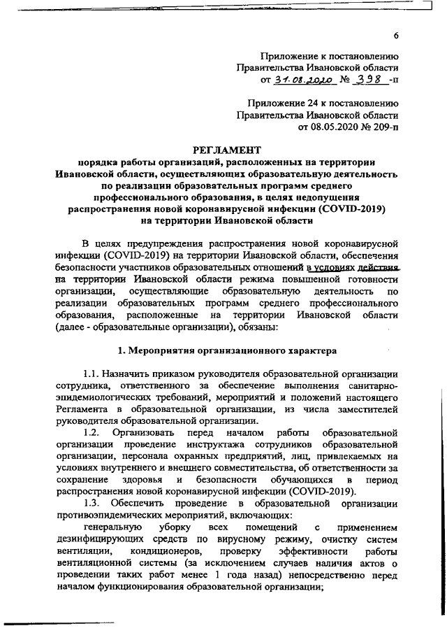 Постановление Правительства Ивановской области от 31.08.2020 N 398-п "О внесении изменений в постановление Правительства Ивановской области от 08.05.2020 N 209-п "Об утверждении регламентов по проведению профилактических мероприятий и дезинфекции в целях недопущения распространения новой коронавирусной инфекции (COVID-2019) на территории Ивановской области" (вместе с "Регламентом порядка работы организаций, расположенных на территории Ивановской области, осуществляющих образовательную деятельность по реализации образовательных программ среднего профессионального образования, в целях недопущения распространения новой коронавирусной инфекции (COVID-2019) на территории Ивановской области")