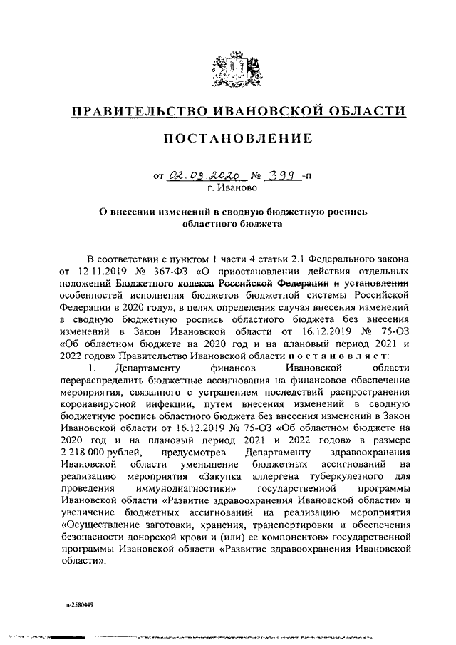 Постановление Правительства Ивановской области от 02.09.2020 N 399-п "О внесении изменений в сводную бюджетную роспись областного бюджета"