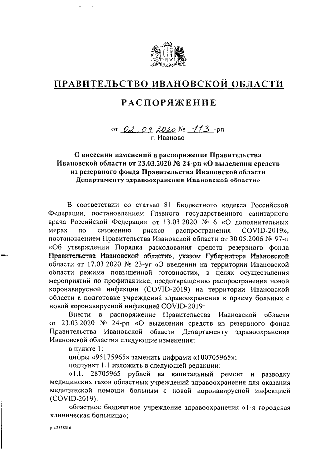Распоряжение Правительства Ивановской области от 02.09.2020 N 113-рп "О внесении изменений в распоряжение Правительства Ивановской области от 23.03.2020 N 24-рп "О выделении средств из резервного фонда Правительства Ивановской области Департаменту здравоохранения Ивановской области"