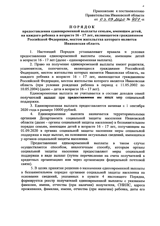Постановление Правительства Ивановской области от 03.09.2020 N 401-п "Об установлении единовременной выплаты семьям, имеющим детей, на каждого ребенка в возрасте 16 - 17 лет, являющегося гражданином Российской Федерации, местом жительства которого является Ивановская область" (вместе с "Порядком предоставления единовременной выплаты семьям, имеющим детей, на каждого ребенка в возрасте 16 - 17 лет, являющегося гражданином Российской Федерации, местом жительства которого является Ивановская область")