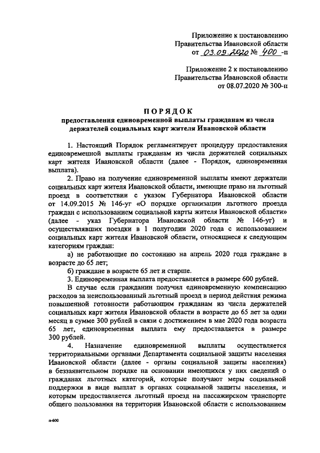 Постановление Правительства Ивановской области от 03.09.2020 N 400-п "О внесении изменений в постановление Правительства Ивановской области от 08.07.2020 N 300-п "О единовременной компенсации расходов за неиспользованный льготный проезд в период действия режима повышенной готовности в мае - июне 2020 года работающим гражданам из числа держателей социальных карт жителя Ивановской области в возрасте до 65 лет" (вместе с "Порядком предоставления единовременной выплаты гражданам из числа держателей социальных карт жителя Ивановской области")