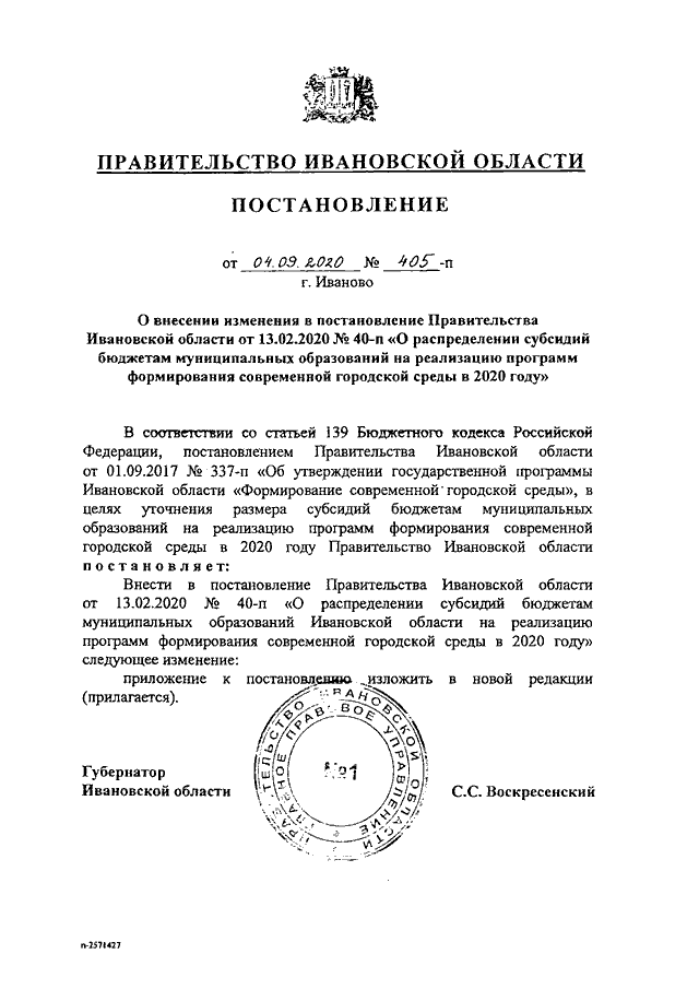 Постановление Правительства Ивановской области от 04.09.2020 N 405-п "О внесении изменения в постановление Правительства Ивановской области от 13.02.2020 N 40-п "О распределении субсидий бюджетам муниципальных образований на реализацию программ формирования современной городской среды в 2020 году"