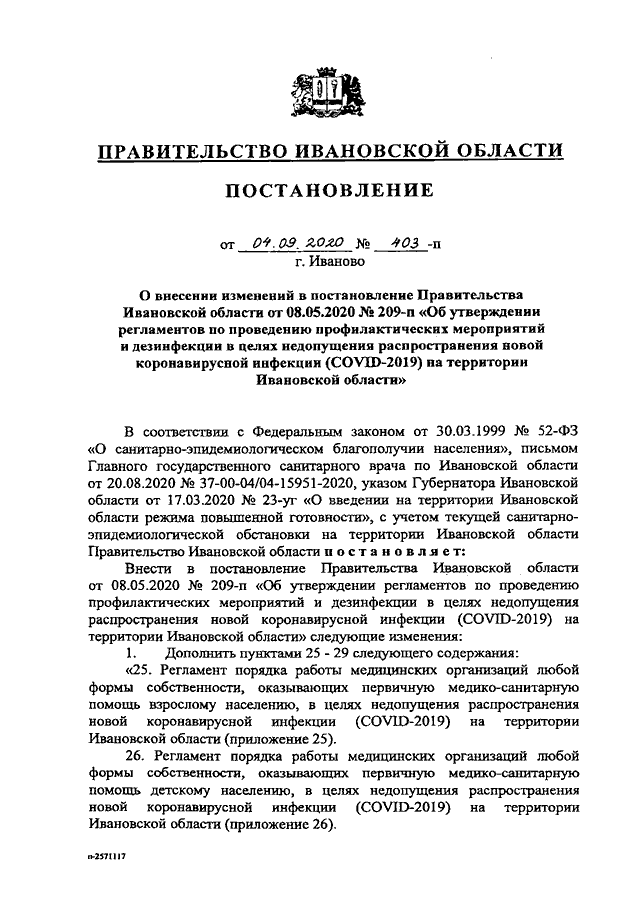 Постановление Правительства Ивановской области от 04.09.2020 N 403-п "О внесении изменений в постановление Правительства Ивановской области от 08.05.2020 N 209-п "Об утверждении регламентов по проведению профилактических мероприятий и дезинфекции в целях недопущения распространения новой коронавирусной инфекции (COVID-2019) на территории Ивановской области" (вместе с "Регламентом порядка работы медицинских организаций любой формы собственности, оказывающих первичную медико-санитарную помощь взрослому населению, в целях недопущения распространения новой коронавирусной инфекции (COVID-2019) на территории Ивановской области", "Регламентом порядка работы медицинских организаций любой формы собственности, оказывающих первичную медико-санитарную помощь детскому населению, в целях недопущения распространения новой коронавирусной инфекции (COVID-2019) на территории Ивановской области", "Регламентом порядка работы медицинских организаций любой формы собственности, оказывающих первичную специализированную медико-санитарную помощь по профилю "стоматология", в целях недопущения распространения новой коронавирусной инфекции (COVID-2019) на территории Ивановской области", "Регламентом порядка работы мобильных комплексов и мобильных бригад в медицинских организациях любой формы собственности, оказывающих первичную медико-санитарную помощь, в целях недопущения распространения новой коронавирусной инфекции (COVID-2019) на территории Ивановской области", "Регламентом порядка госпитализации в медицинские организации любой формы собственности, осуществляющие специализированную, в том числе высокотехнологичную, медицинскую помощь, в условиях круглосуточного стационара в плановой форме, в целях недопущения распространения новой коронавирусной инфекции (COVID-2019) на территории Ивановской области")