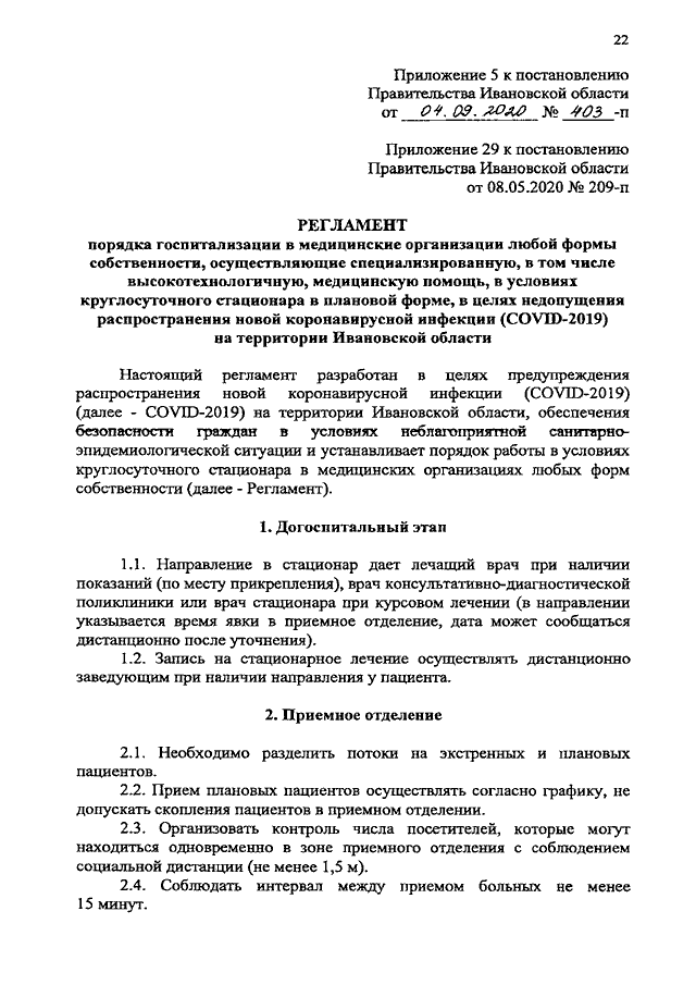 Постановление Правительства Ивановской области от 04.09.2020 N 403-п "О внесении изменений в постановление Правительства Ивановской области от 08.05.2020 N 209-п "Об утверждении регламентов по проведению профилактических мероприятий и дезинфекции в целях недопущения распространения новой коронавирусной инфекции (COVID-2019) на территории Ивановской области" (вместе с "Регламентом порядка работы медицинских организаций любой формы собственности, оказывающих первичную медико-санитарную помощь взрослому населению, в целях недопущения распространения новой коронавирусной инфекции (COVID-2019) на территории Ивановской области", "Регламентом порядка работы медицинских организаций любой формы собственности, оказывающих первичную медико-санитарную помощь детскому населению, в целях недопущения распространения новой коронавирусной инфекции (COVID-2019) на территории Ивановской области", "Регламентом порядка работы медицинских организаций любой формы собственности, оказывающих первичную специализированную медико-санитарную помощь по профилю "стоматология", в целях недопущения распространения новой коронавирусной инфекции (COVID-2019) на территории Ивановской области", "Регламентом порядка работы мобильных комплексов и мобильных бригад в медицинских организациях любой формы собственности, оказывающих первичную медико-санитарную помощь, в целях недопущения распространения новой коронавирусной инфекции (COVID-2019) на территории Ивановской области", "Регламентом порядка госпитализации в медицинские организации любой формы собственности, осуществляющие специализированную, в том числе высокотехнологичную, медицинскую помощь, в условиях круглосуточного стационара в плановой форме, в целях недопущения распространения новой коронавирусной инфекции (COVID-2019) на территории Ивановской области")