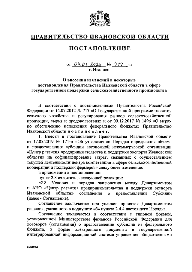 Постановление Правительства Ивановской области от 04.09.2020 N 414-п "О внесении изменений в некоторые постановления Правительства Ивановской области в сфере государственной поддержки сельскохозяйственного производства"