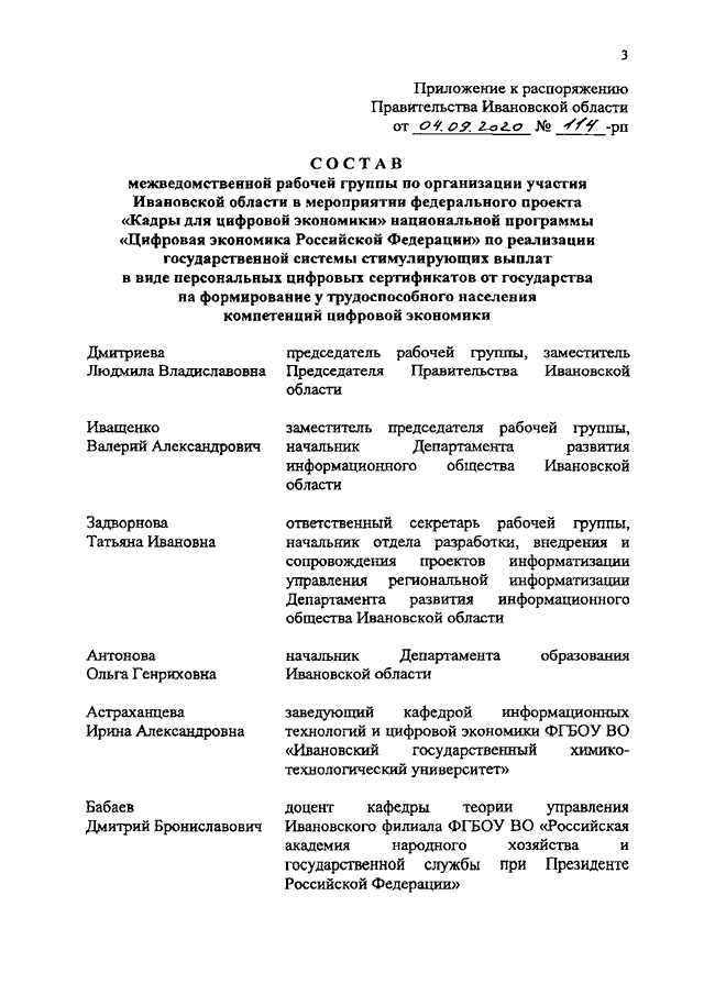 Распоряжение Правительства Ивановской области от 04.09.2020 N 114-рп "О создании межведомственной рабочей группы по организации участия Ивановской области в мероприятии федерального проекта "Кадры для цифровой экономики" национальной программы "Цифровая экономика Российской Федерации" по реализации государственной системы стимулирующих выплат в виде персональных цифровых сертификатов от государства на формирование у трудоспособного населения компетенций цифровой экономики"