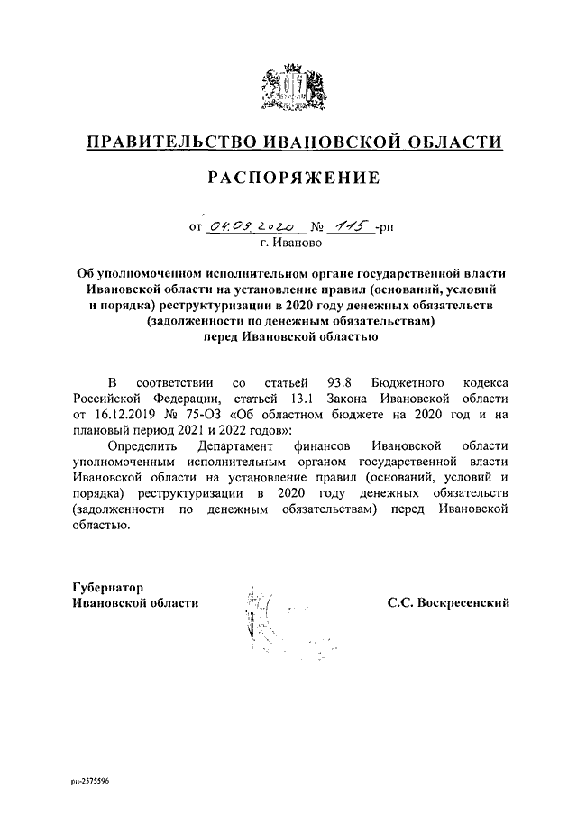 Распоряжение Правительства Ивановской области от 04.09.2020 N 115-рп "Об уполномоченном исполнительном органе государственной власти Ивановской области на установление правил (оснований, условий и порядка) реструктуризации в 2020 году денежных обязательств (задолженности по денежным обязательствам) перед Ивановской областью"
