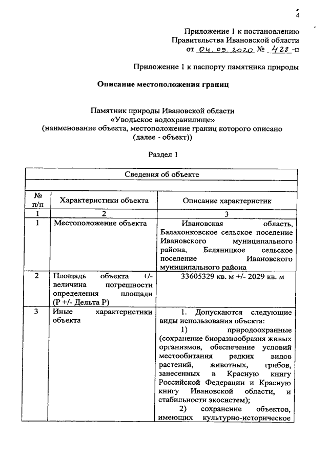 Постановление Правительства Ивановской области от 04.09.2020 N 428-п "О внесении изменений в постановление Правительства Ивановской области от 24.06.2014 N 250-п "О памятнике природы Ивановской области "Уводьское водохранилище" (вместе с "Картой (схемой) границ памятника природы Ивановской области "Уводьское водохранилище" с зонами регулируемого посещения - резерватами")