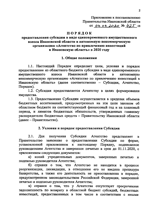 Постановление Правительства Ивановской области от 04.09.2020 N 425-п "Об утверждении Порядка предоставления субсидии в виде единовременного имущественного взноса Ивановской области в автономную некоммерческую организацию "Агентство по привлечению инвестиций в Ивановскую область" в 2020 году"