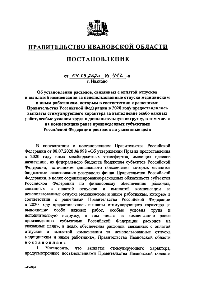 Постановление Правительства Ивановской области от 04.09.2020 N 412-п "Об установлении расходов, связанных с оплатой отпусков и выплатой компенсации за неиспользованные отпуска медицинским и иным работникам, которым в соответствии с решениями Правительства Российской Федерации в 2020 году предоставлялись выплаты стимулирующего характера за выполнение особо важных работ, особые условия труда и дополнительную нагрузку, в том числе на компенсацию ранее произведенных субъектами Российской Федерации расходов на указанные цели"