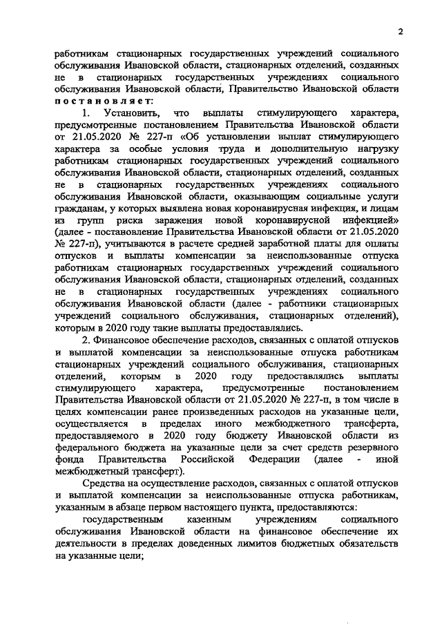 Постановление Правительства Ивановской области от 04.09.2020 N 411-п "Об установлении расходов, связанных с оплатой отпусков и выплатой компенсации за неиспользованные отпуска работникам стационарных государственных учреждений социального обслуживания Ивановской области, стационарных отделений, созданных не в стационарных государственных учреждениях социального обслуживания Ивановской области, которым в соответствии с решениями Правительства Российской Федерации в 2020 году предоставлялись выплаты стимулирующего характера за особые условия труда и дополнительную нагрузку, в том числе в целях компенсации ранее произведенных субъектами Российской Федерации расходов на указанные цели"