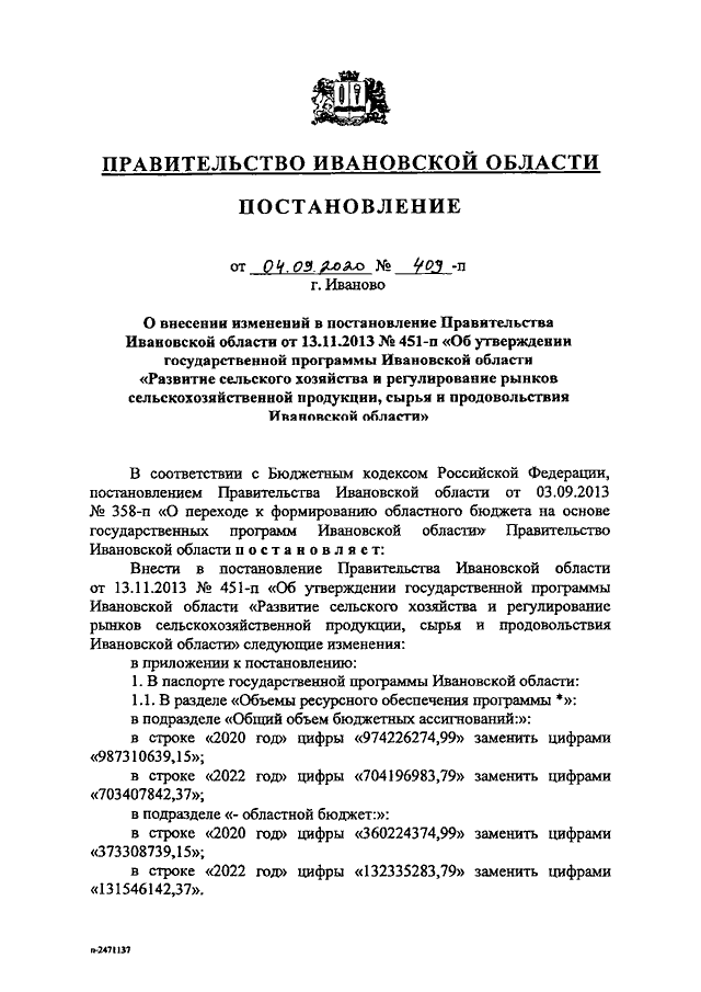Постановление Правительства Ивановской области от 04.09.2020 N 409-п "О внесении изменений в постановление Правительства Ивановской области от 13.11.2013 N 451-п "Об утверждении государственной программы Ивановской области "Развитие сельского хозяйства и регулирование рынков сельскохозяйственной продукции, сырья и продовольствия Ивановской области"