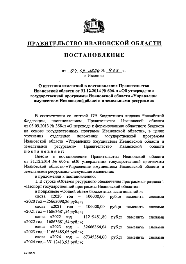Постановление Правительства Ивановской области от 04.09.2020 N 408-п "О внесении изменений в постановление Правительства Ивановской области от 31.12.2014 N 606-п "Об утверждении государственной программы Ивановской области "Управление имуществом Ивановской области и земельными ресурсами"