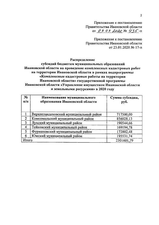 Постановление Правительства Ивановской области от 09.09.2020 N 435-п "О внесении изменения в постановление Правительства Ивановской области от 23.01.2020 N 17-п "О распределении субсидий бюджетам муниципальных образований Ивановской области на проведение комплексных кадастровых работ на территории Ивановской области в рамках подпрограммы "Комплексные кадастровые работы на территории Ивановской области" государственной программы Ивановской области "Управление имуществом Ивановской области и земельными ресурсами" в 2020 году"