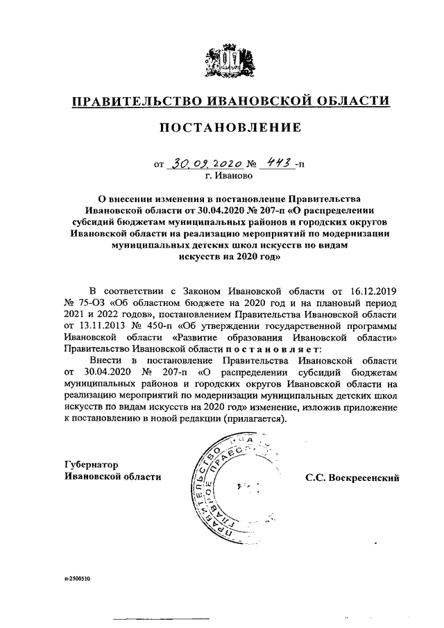 Постановление Правительства Ивановской области от 30.09.2020 N 443-п "О внесении изменения в постановление Правительства Ивановской области от 30.04.2020 N 207-п "О распределении субсидий бюджетам муниципальных районов и городских округов Ивановской области на реализацию мероприятий по модернизации муниципальных детских школ искусств по видам искусств на 2020 год"