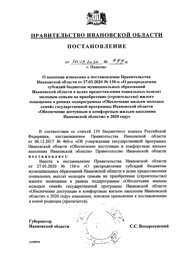 Постановление Правительства Ивановской области от 30.09.2020 N 444-п "О внесении изменения в постановление Правительства Ивановской области от 27.03.2020 N 130-п "О распределении субсидий бюджетам муниципальных образований Ивановской области в целях предоставления социальных выплат молодым семьям на приобретение (строительство) жилого помещения в рамках подпрограммы "Обеспечение жильем молодых семей" государственной программы Ивановской области "Обеспечение доступным и комфортным жильем населения Ивановской области" в 2020 году"