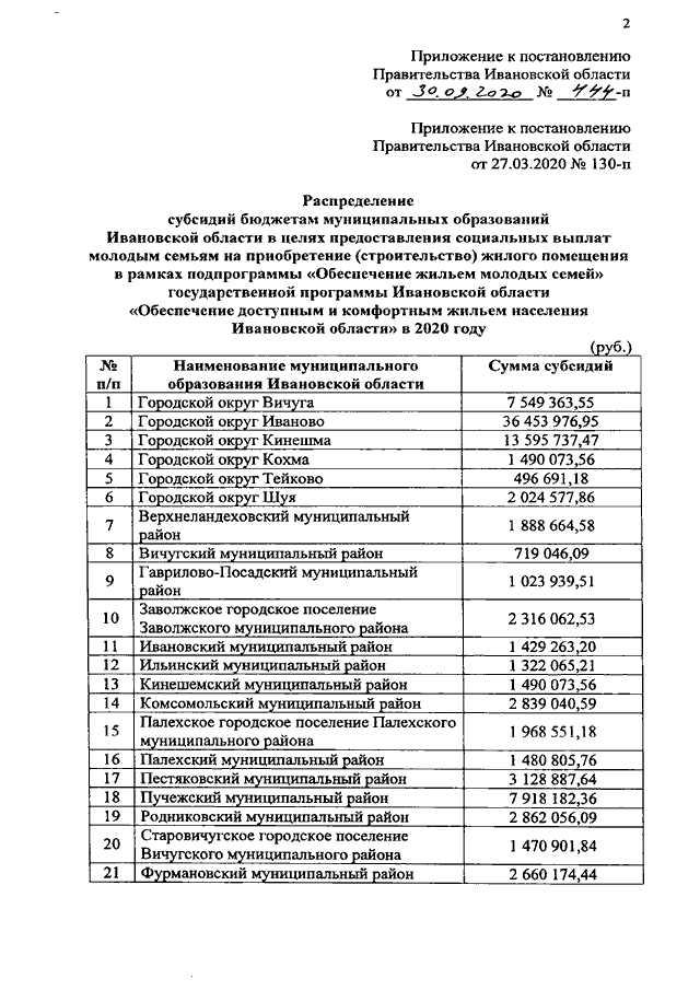 Постановление Правительства Ивановской области от 30.09.2020 N 444-п "О внесении изменения в постановление Правительства Ивановской области от 27.03.2020 N 130-п "О распределении субсидий бюджетам муниципальных образований Ивановской области в целях предоставления социальных выплат молодым семьям на приобретение (строительство) жилого помещения в рамках подпрограммы "Обеспечение жильем молодых семей" государственной программы Ивановской области "Обеспечение доступным и комфортным жильем населения Ивановской области" в 2020 году"