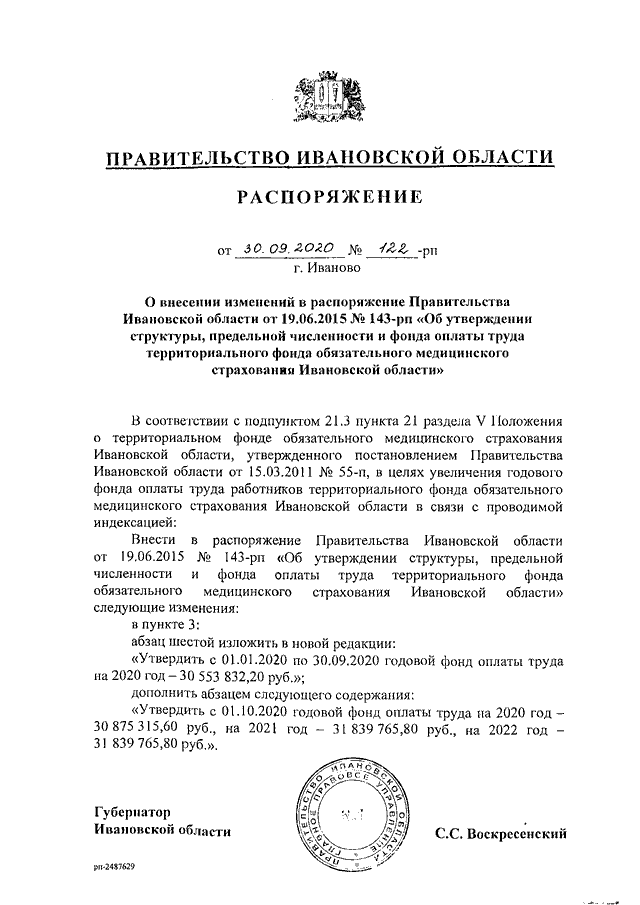 Распоряжение Правительства Ивановской области от 30.09.2020 N 122-рп "О внесении изменений в распоряжение Правительства Ивановской области от 19.06.2015 N 143-рп "Об утверждении структуры, предельной численности и фонда оплаты труда территориального фонда обязательного медицинского страхования Ивановской области"