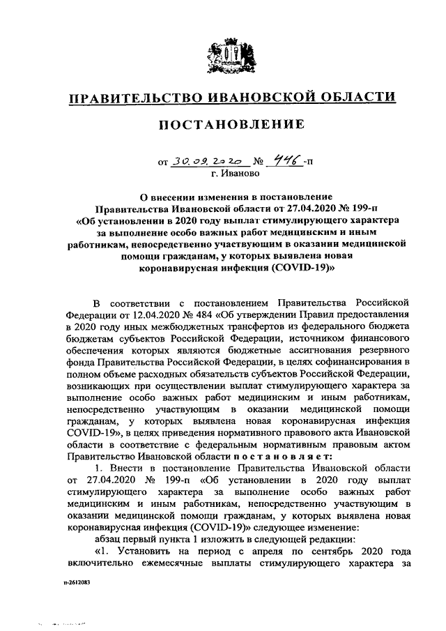 Постановление Правительства Ивановской области от 30.09.2020 N 446-п "О внесении изменения в постановление Правительства Ивановской области от 27.04.2020 N 199-п "Об установлении в 2020 году выплат стимулирующего характера за выполнение особо важных работ медицинским и иным работникам, непосредственно участвующим в оказании медицинской помощи гражданам, у которых выявлена новая коронавирусная инфекция (COVID-19)"