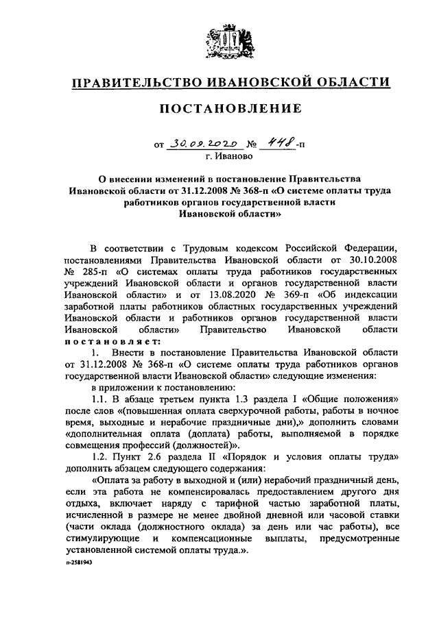 Постановление Правительства Ивановской области от 30.09.2020 N 448-п "О внесении изменений в постановление Правительства Ивановской области от 31.12.2008 N 368-п "О системе оплаты труда работников органов государственной власти Ивановской области"