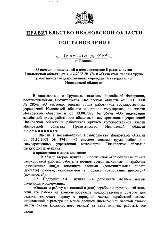 Постановление Правительства Ивановской области от 30.09.2020 N 449-п "О внесении изменений в постановление Правительства Ивановской области от 31.12.2008 N 374-п "О системе оплаты труда работников государственных учреждений ветеринарии Ивановской области"