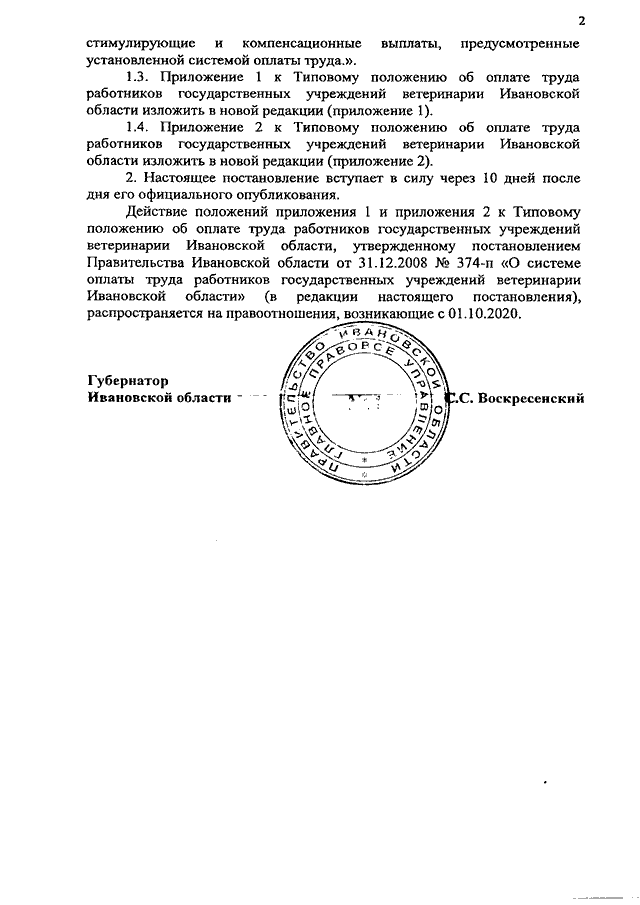 Постановление Правительства Ивановской области от 30.09.2020 N 449-п "О внесении изменений в постановление Правительства Ивановской области от 31.12.2008 N 374-п "О системе оплаты труда работников государственных учреждений ветеринарии Ивановской области"
