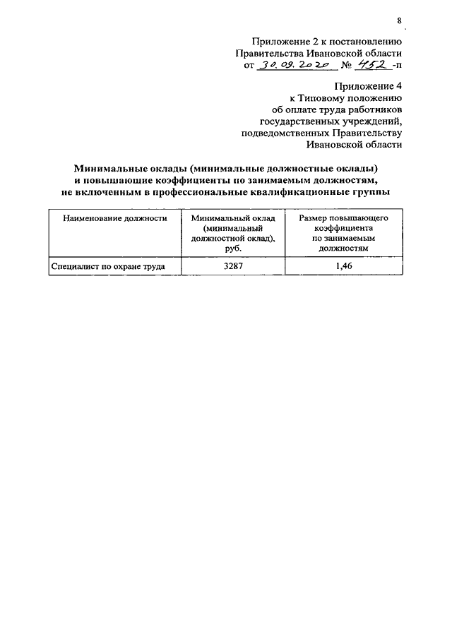 Постановление Правительства Ивановской области от 30.09.2020 N 452-п "О внесении изменений в постановление Правительства Ивановской области от 31.12.2008 N 372-п "О системе оплаты труда работников государственных учреждений, подведомственных Правительству Ивановской области" (вместе с "Перечнем профессиональных квалификационных групп должностей работников государственных учреждений, подведомственных Правительству Ивановской области")
