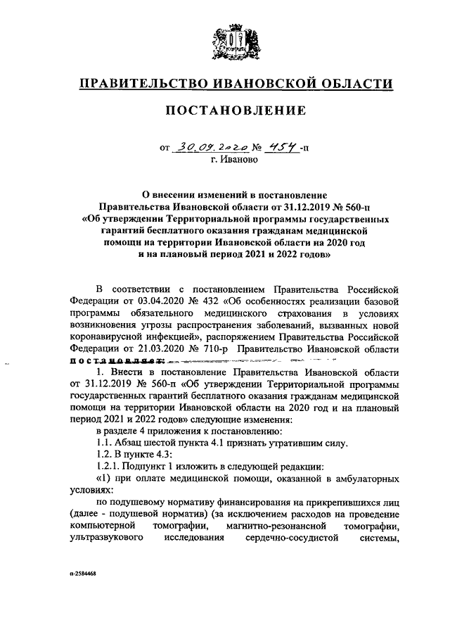 Постановление Правительства Ивановской области от 30.09.2020 N 454-п "О внесении изменений в постановление Правительства Ивановской области от 31.12.2019 N 560-п "Об утверждении Территориальной программы государственных гарантий бесплатного оказания гражданам медицинской помощи на территории Ивановской области на 2020 год и на плановый период 2021 и 2022 годов"
